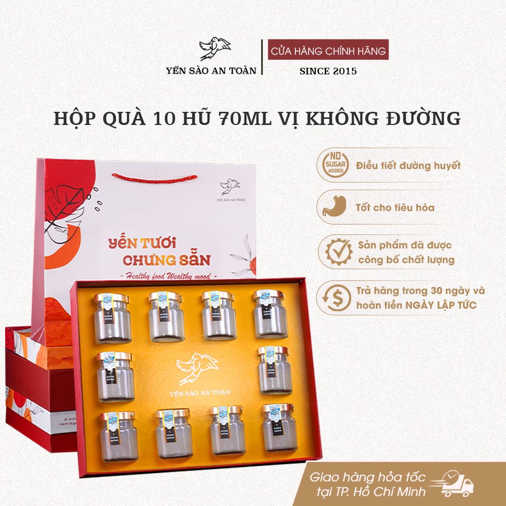 - Đóng trong hũ thủy tinh đảm bảo an toàn thực phẩm. Sản phẩm bao gồm 1 hộp quà sang trọng 10 hũ 70ml