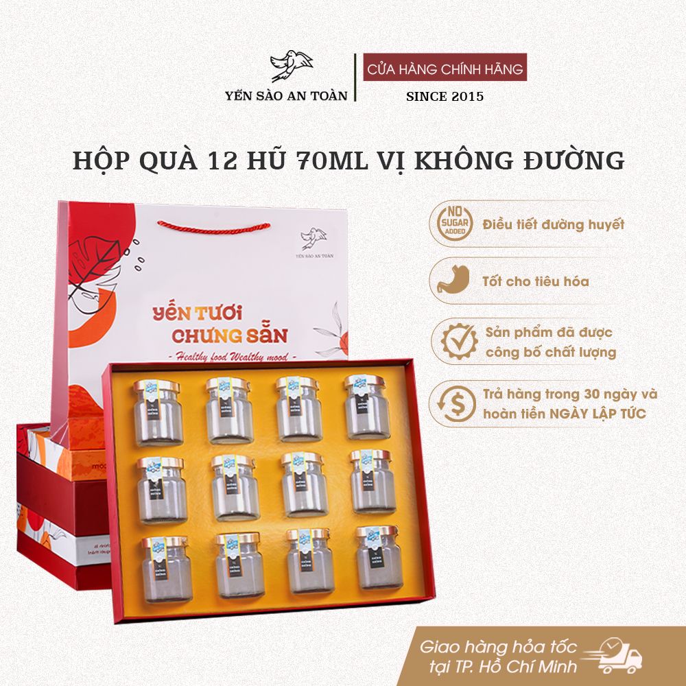 - Đóng trong hũ thủy tinh đảm bảo an toàn thực phẩm. Sản phẩm bao gồm 1 hộp quà sang trọng 12 hũ 70ml