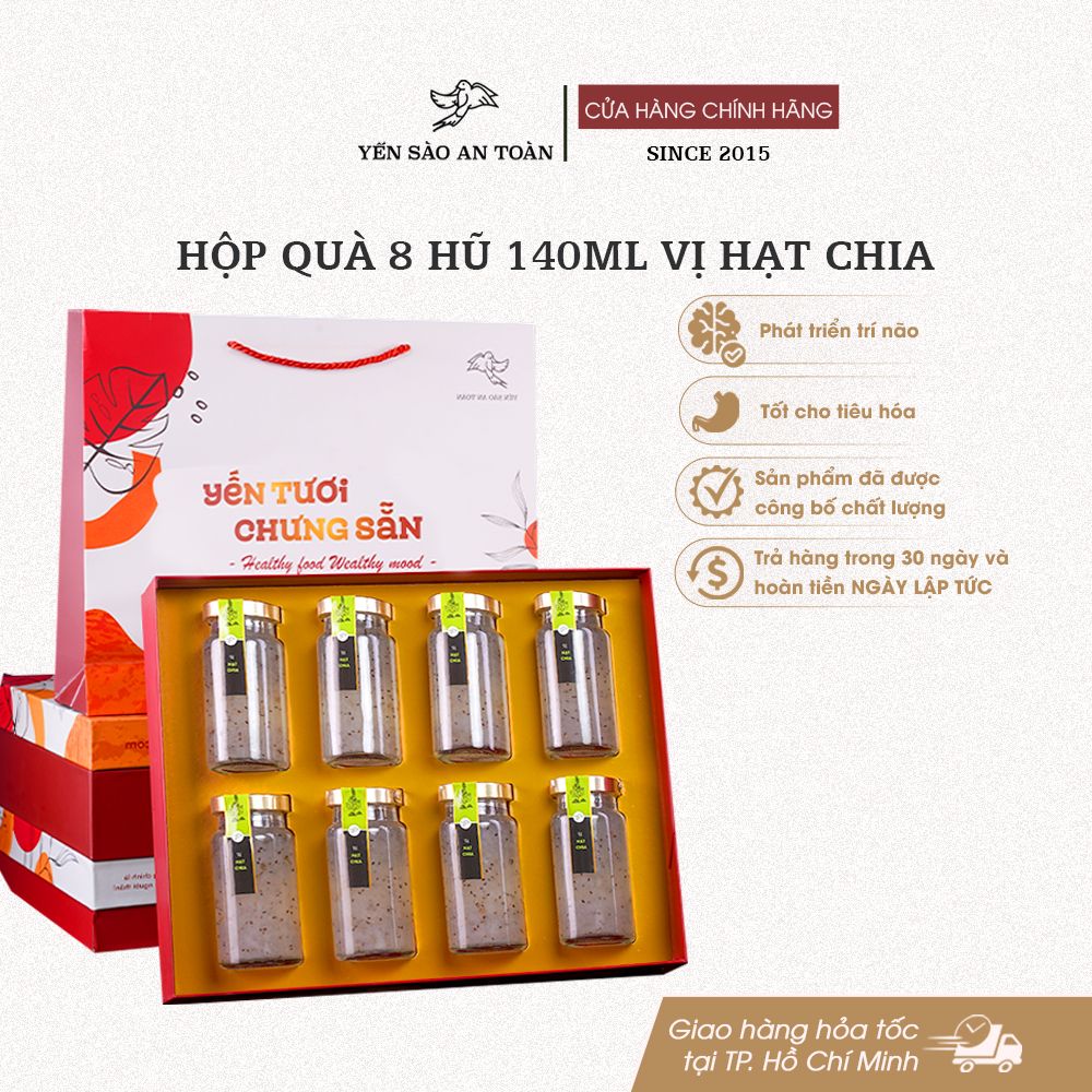 - Đóng trong hũ thủy tinh đảm bảo an toàn thực phẩm. Sản phẩm bao gồm 1 hộp quà sang trọng 8 hũ 140ml
