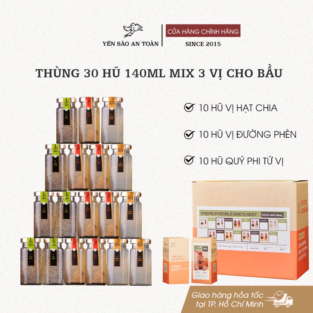 1. Thùng 30 hũ yến tươi chưng sẵn 140ml mix 3 vị cho bầu, bao gồm: