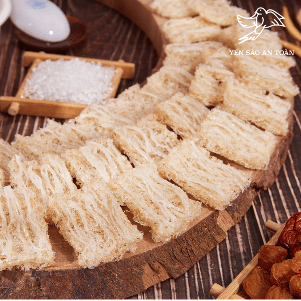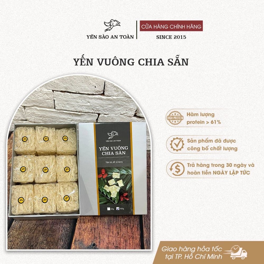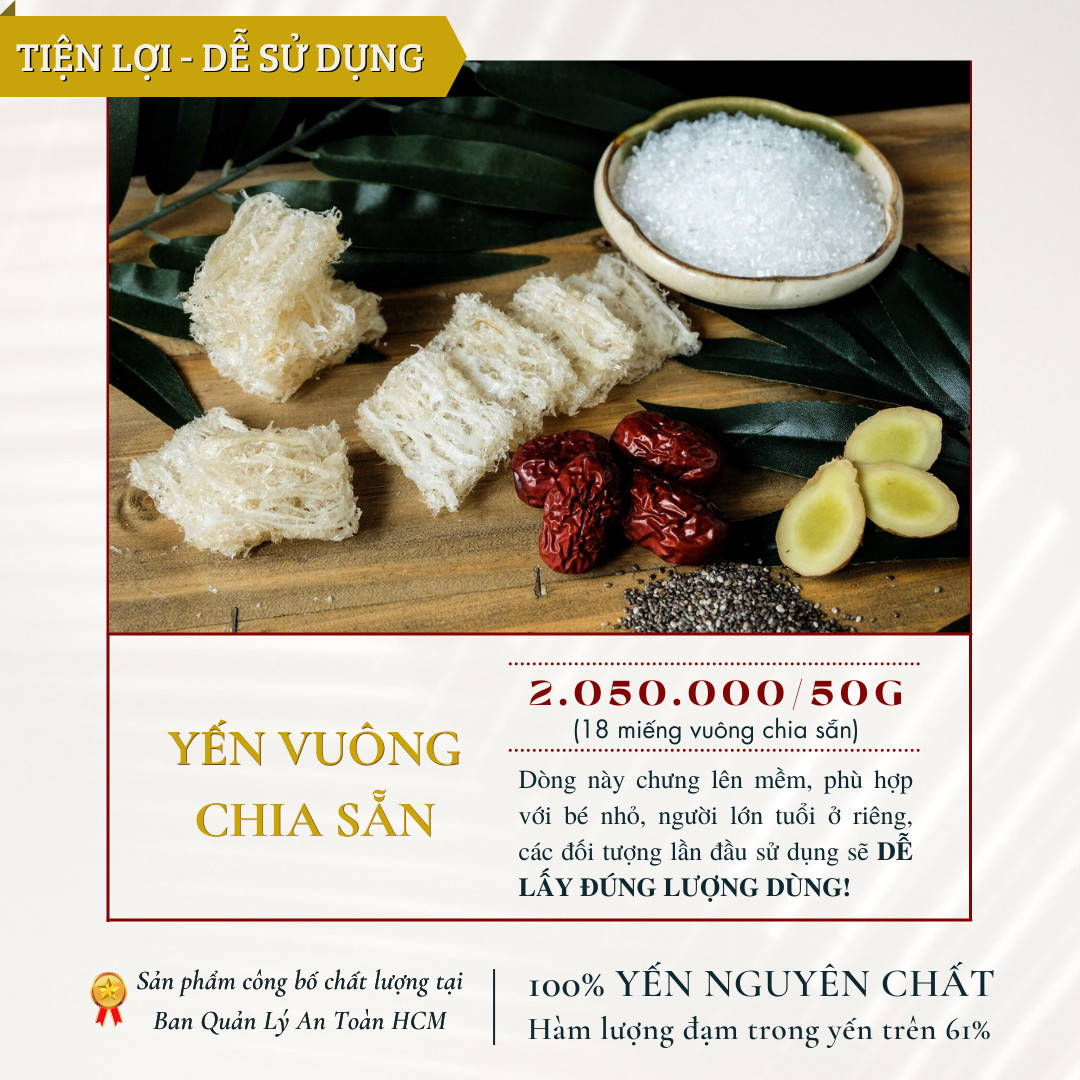 - Chính vì vậy mỗi miếng vuông sẽ có đặc điểm: sợi ngắn, mảnh, 2-4cm ở phía trên, có miếng có cục chân tổ yến dày, chắc; phần dưới là phần ruột vụn của tổ yến khi làm sạch.